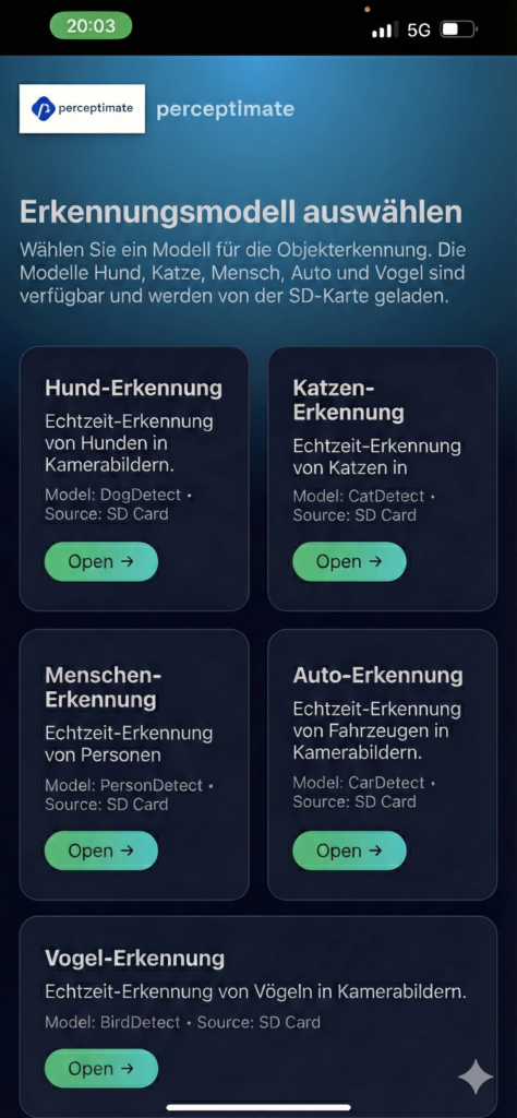 Laden Sie einfach per Smartphone-App neue, maßgeschneiderte KI-Modelle auf Ihr Gerät. Ändern Sie die Hauptfunktion Ihres perceptimate®-Moduls auf Knopfdruck. Von verschiedenen Tierarten bis zum Auto – entdecken Sie jetzt unseren Marktplatz für visuelle Erkennung.
